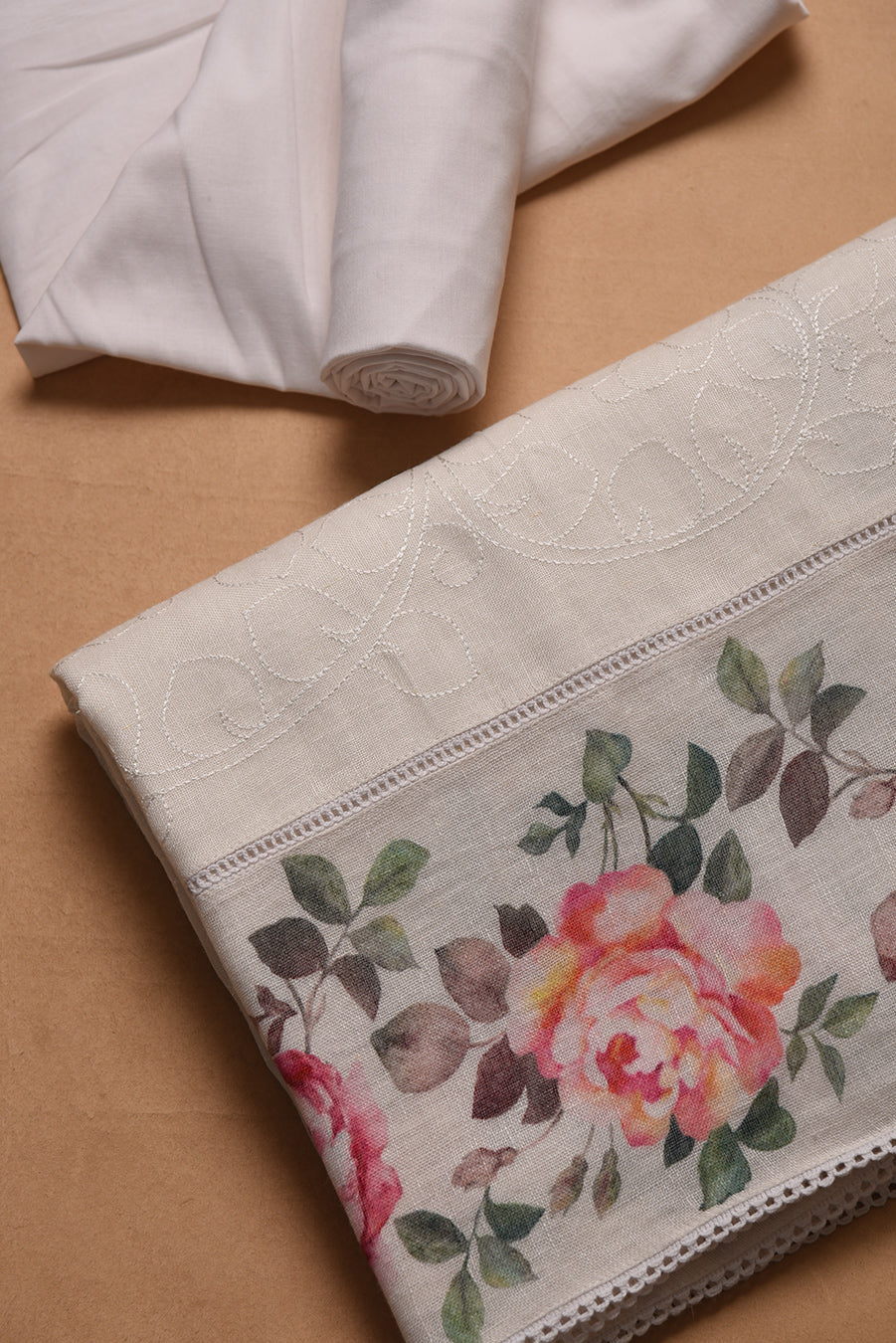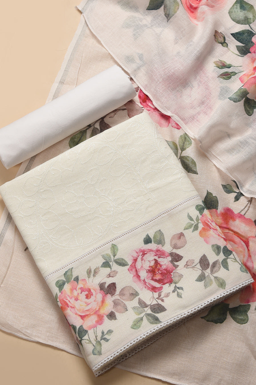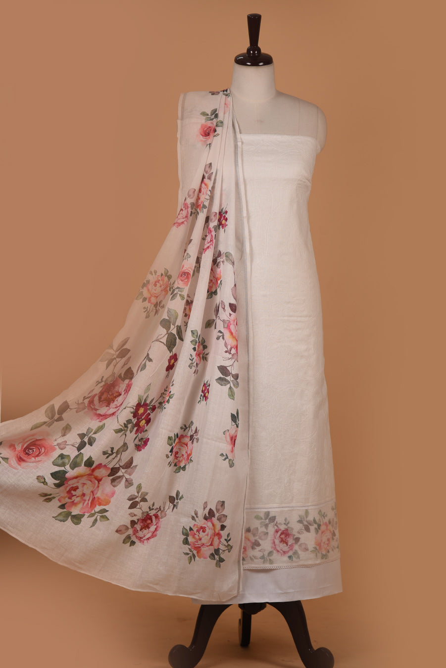 White Linen Printed With Embroidery Unstitched Suit Fabric Set With Linen Dupatta