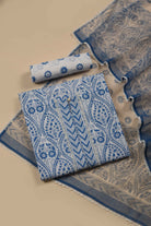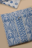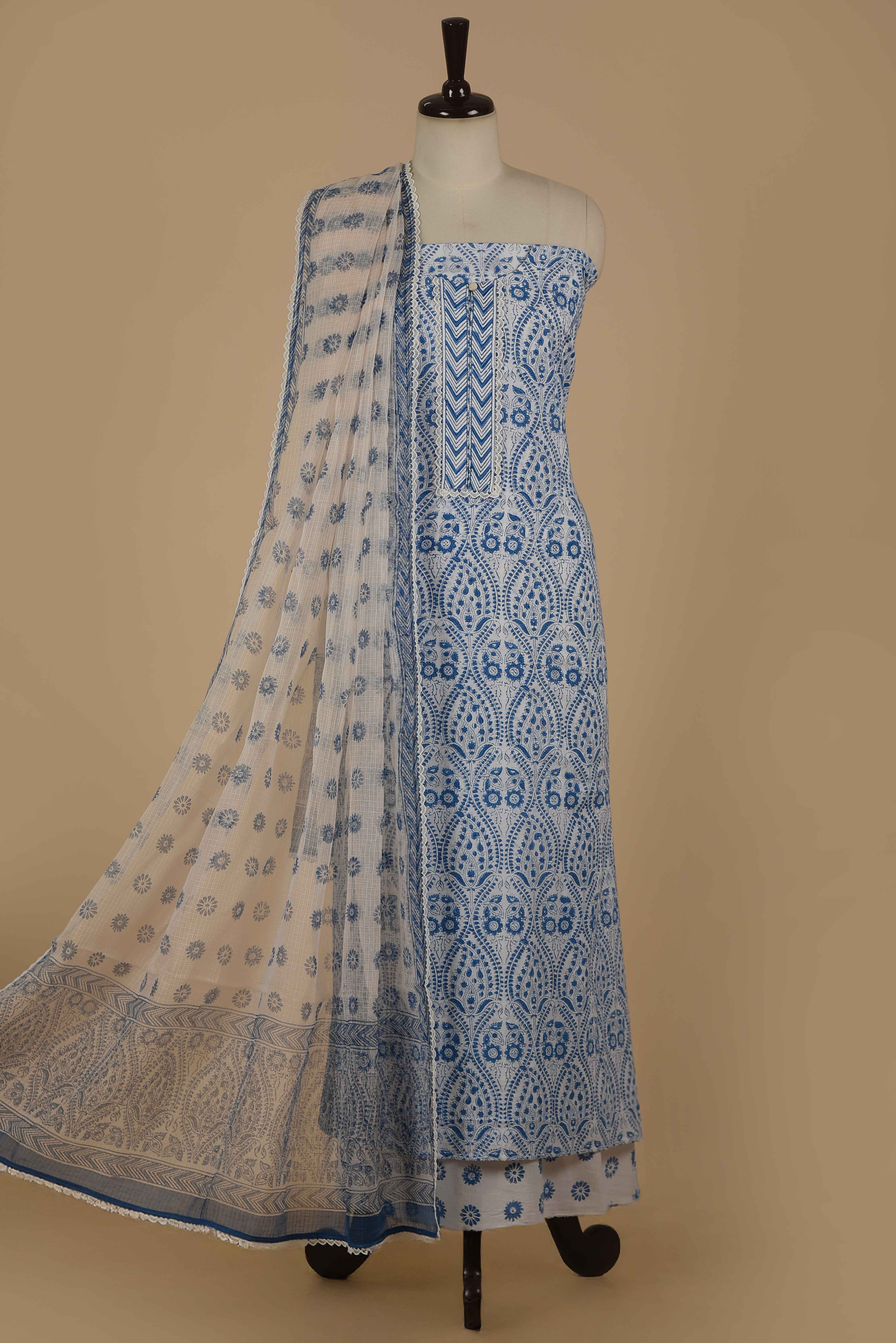White With Blue Pure Cotton Hand Block Printed Unstitched Suit Fabric Set With Printed Kota Dupatta