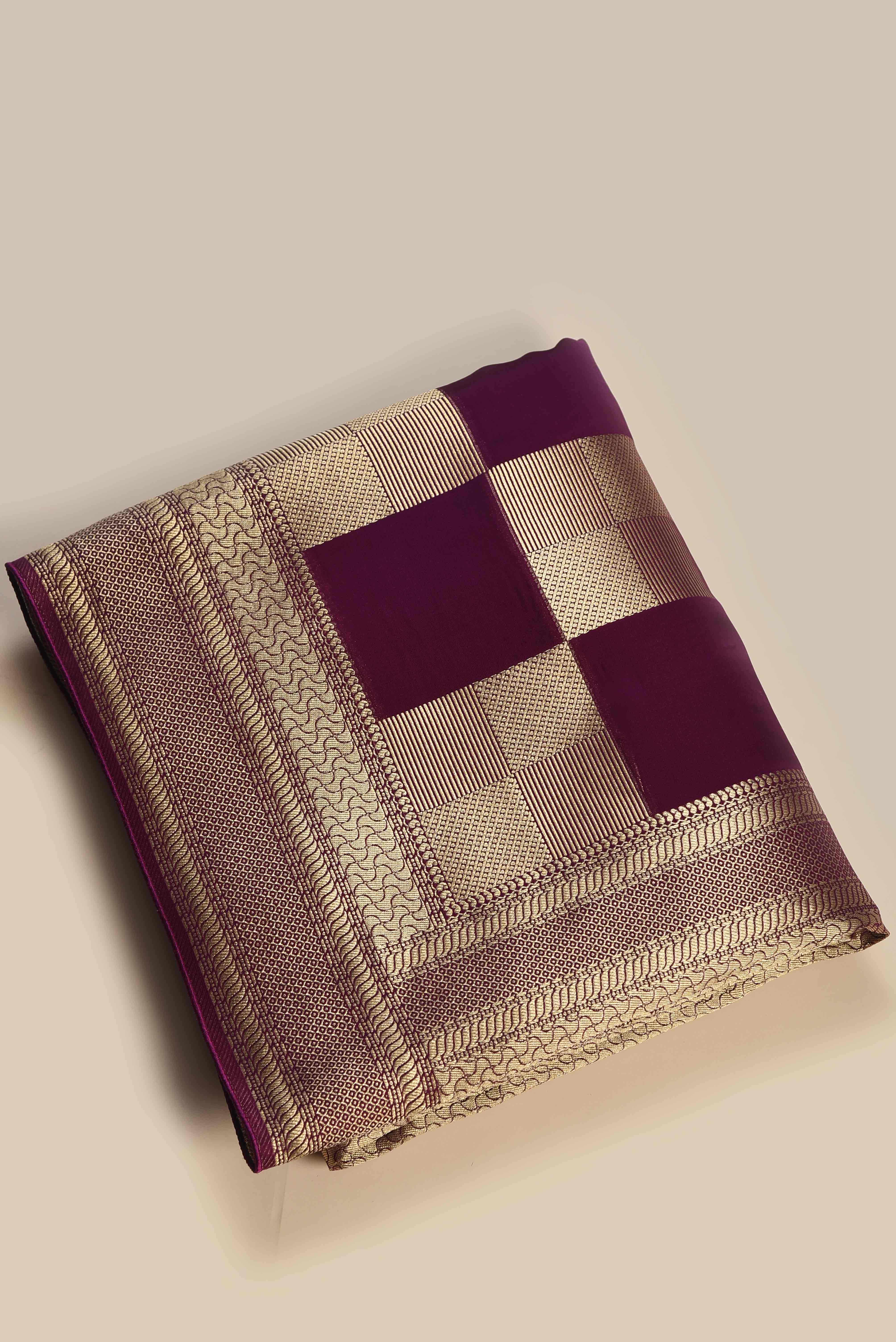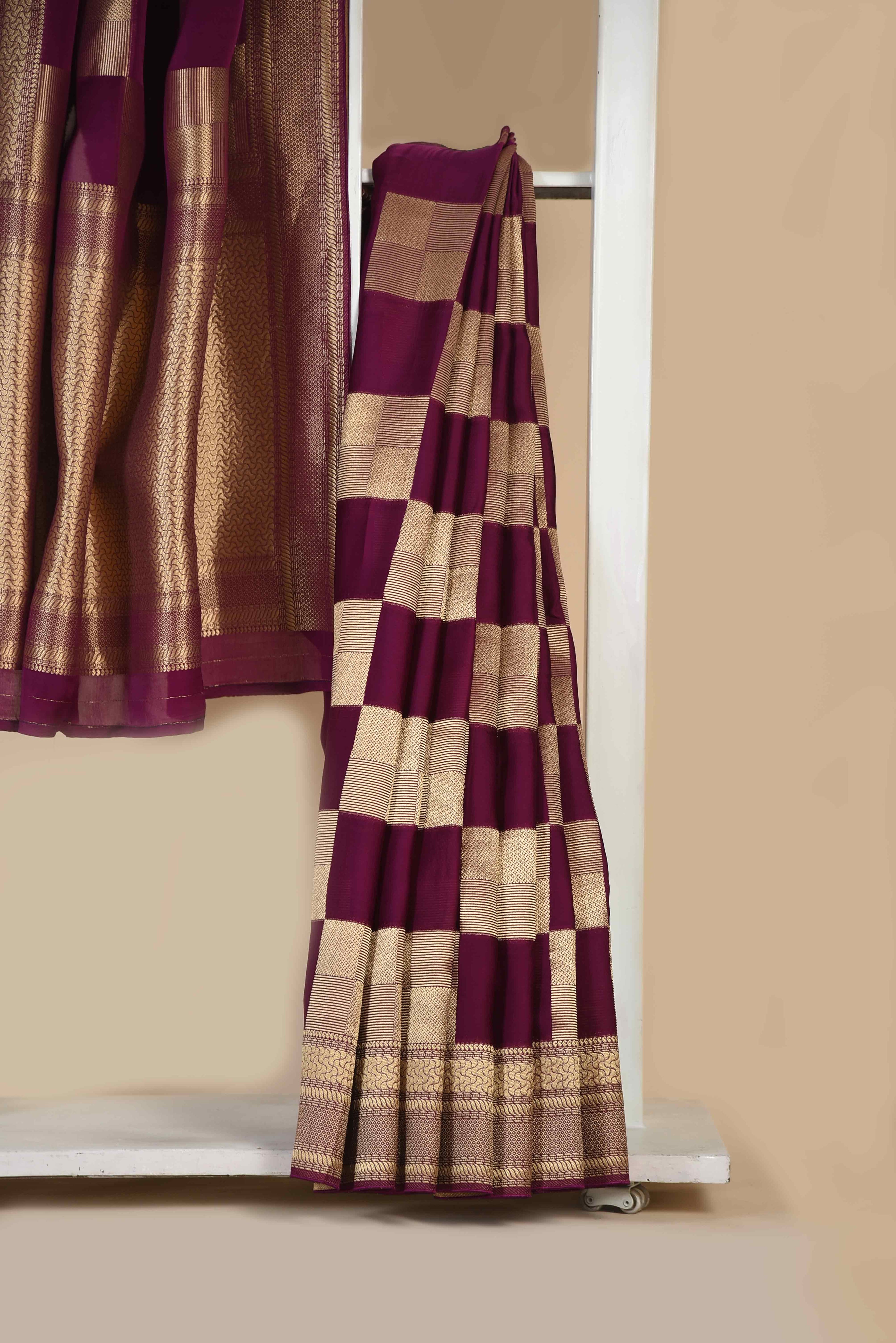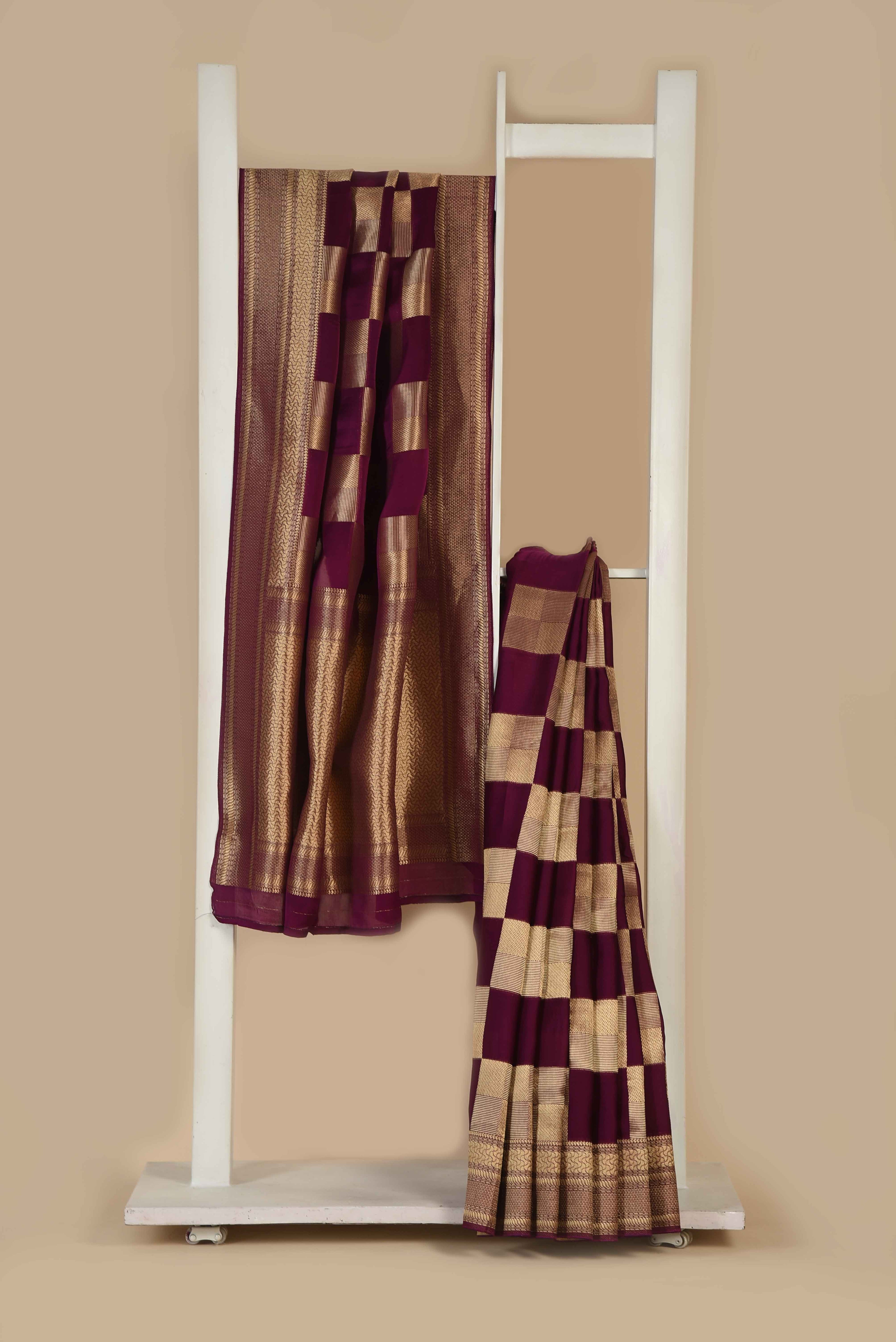 Wine Satin Crepe Woven Saree With Satin Crepe Blouse