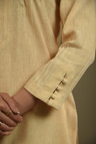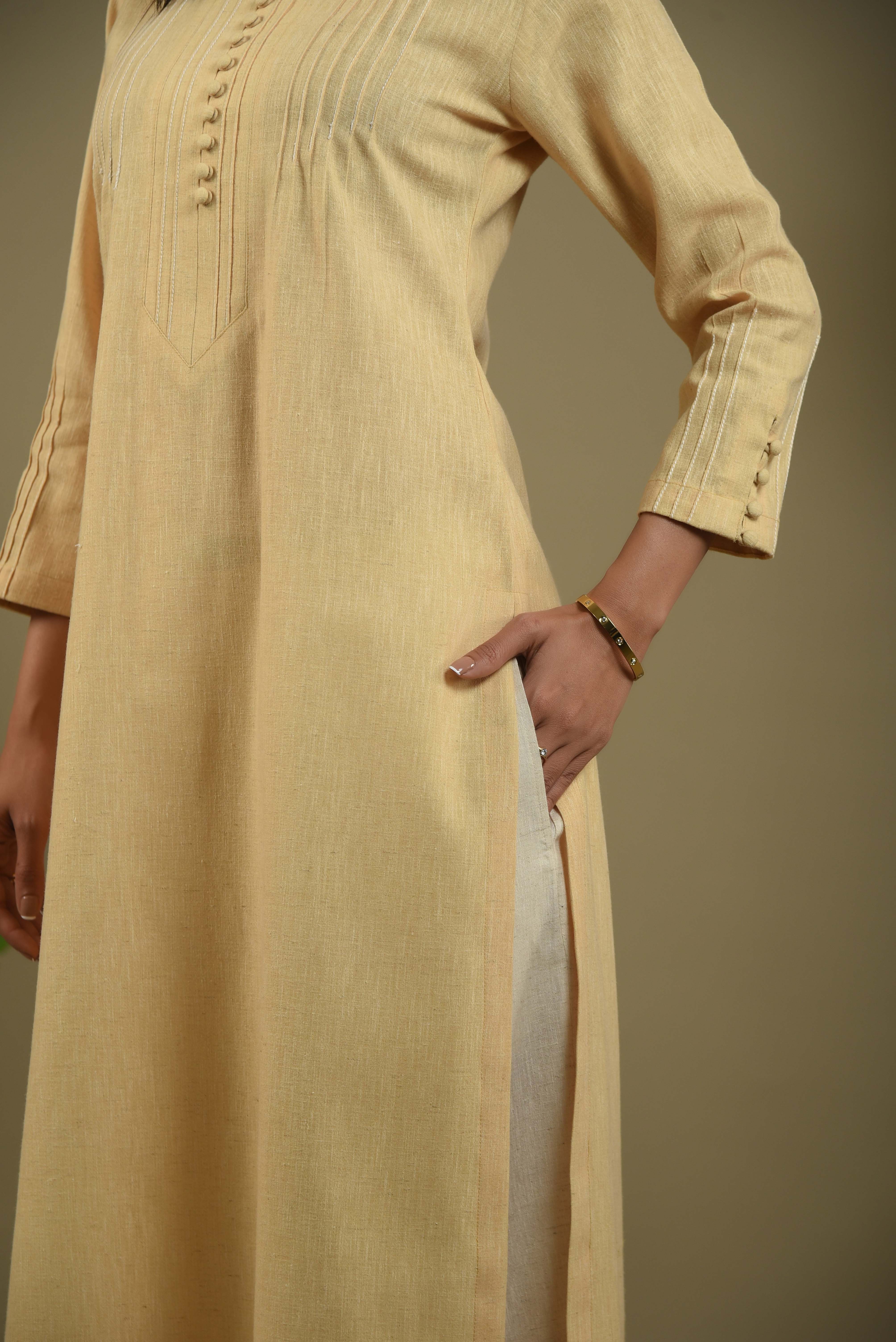 - Elegant pastel yellow kurta set in fine cotton linen blend fabric designed with fine pintuck detailing and fabric buttons on the front yoke for a graceful touch.