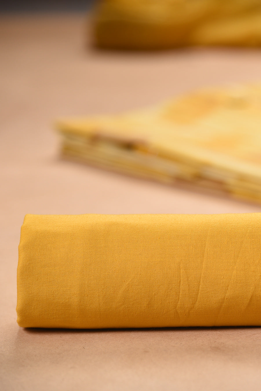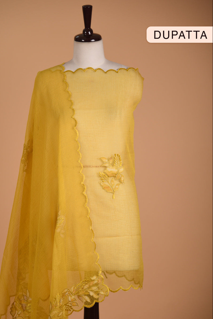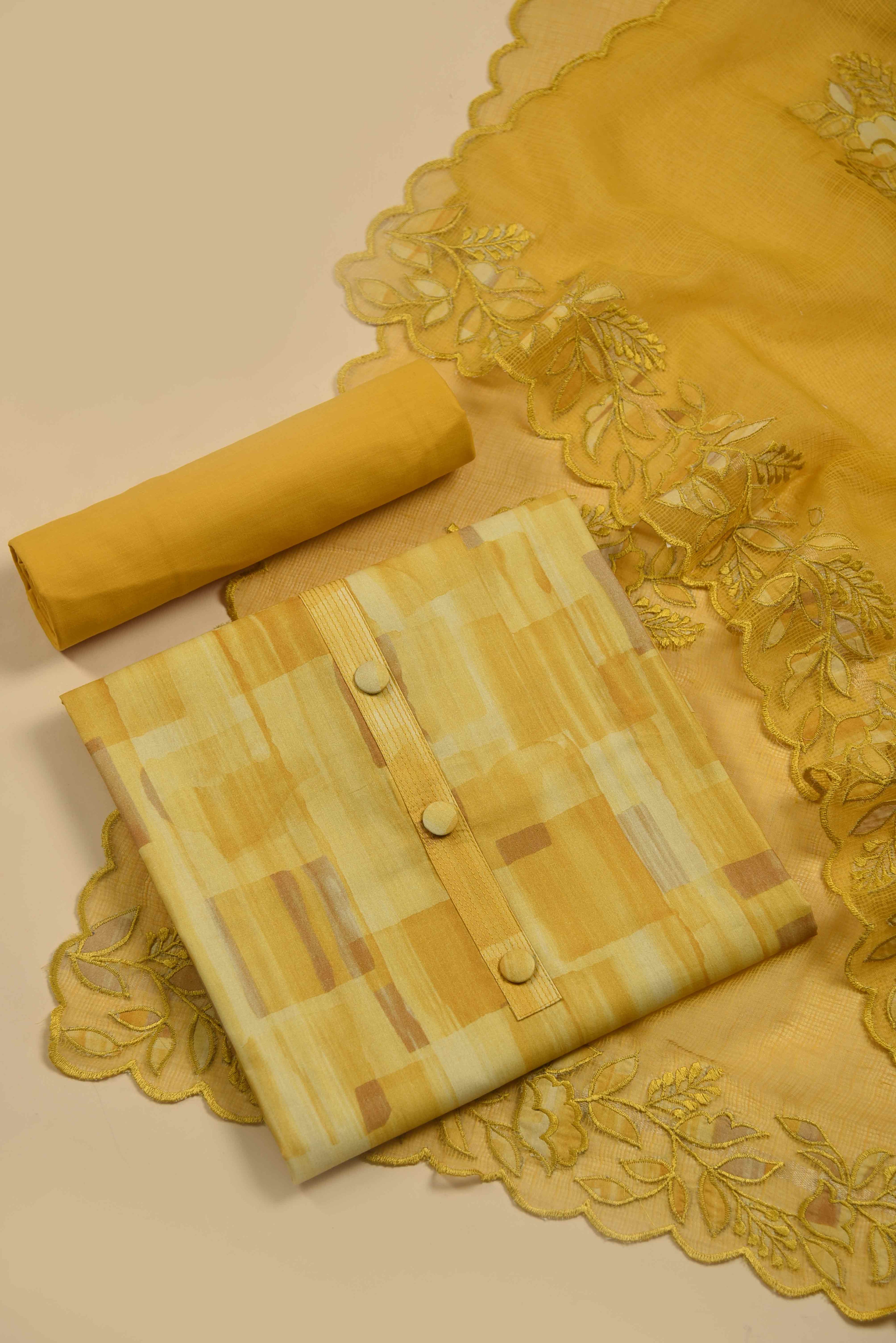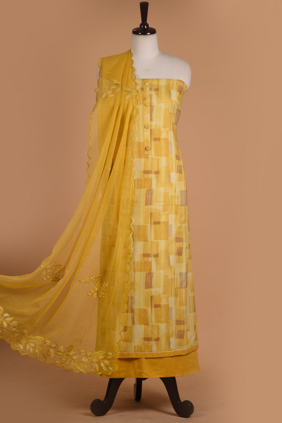 Yellow Cotton Glazed Printed Unstitched Suit Fabric Set With Kota Embroidered Dupatta