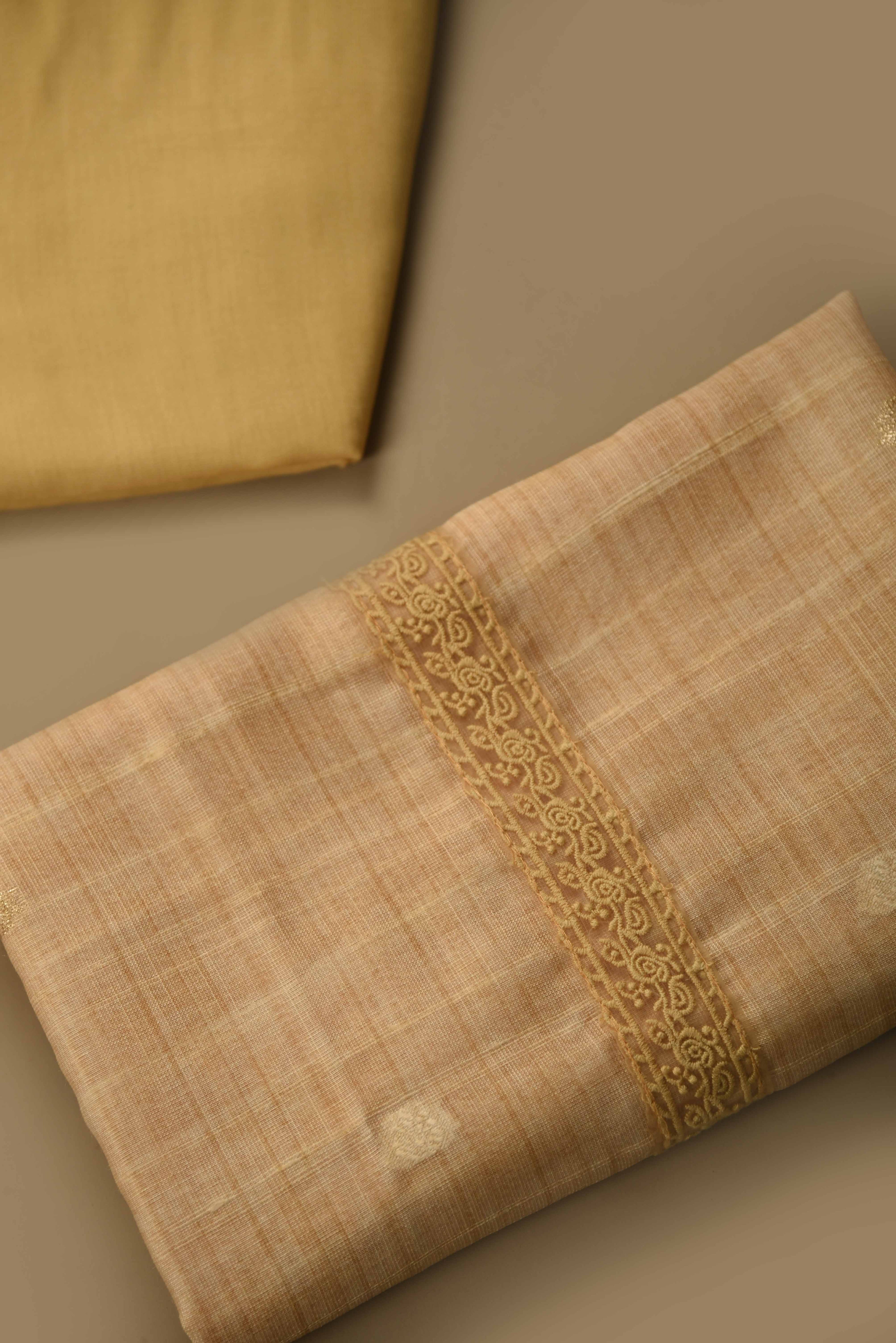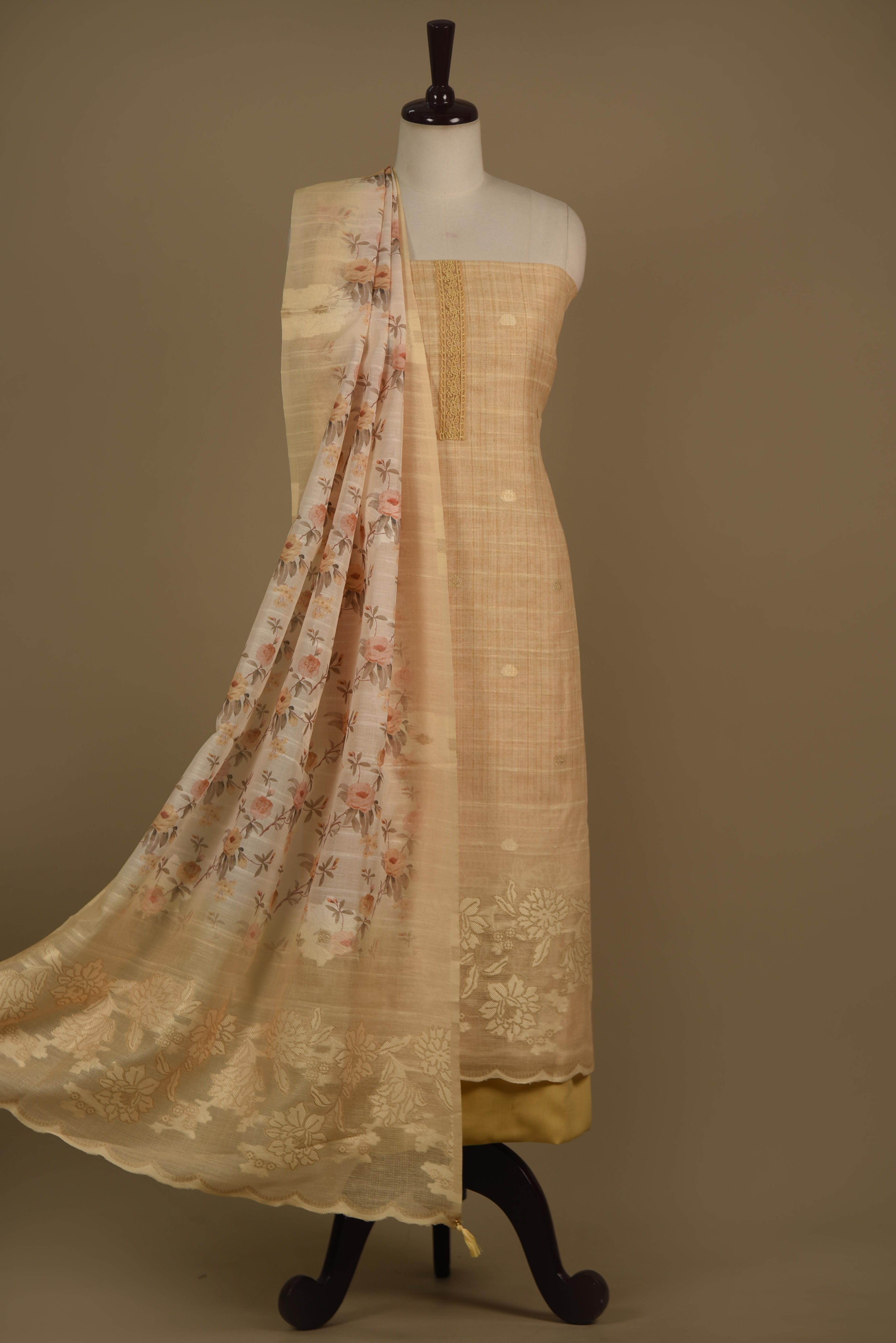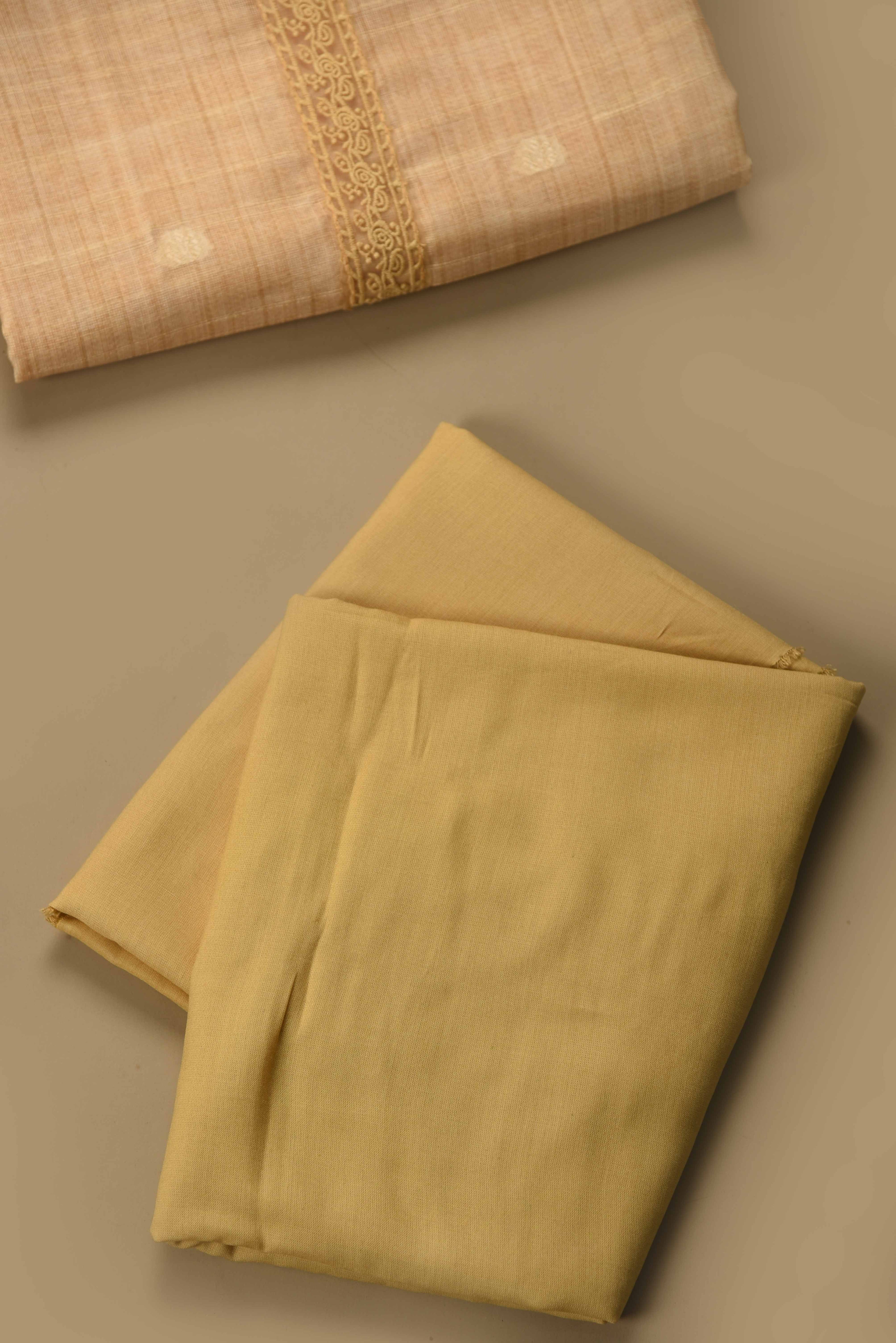 - Bask in the Soft Glow of Summer Elegance Embrace the serene charm of summer with this Yellow Linen Blend Unstitched Suit Fabric Set, thoughtfully woven with delicate embroidery that adds subtle sophistication to every thread.