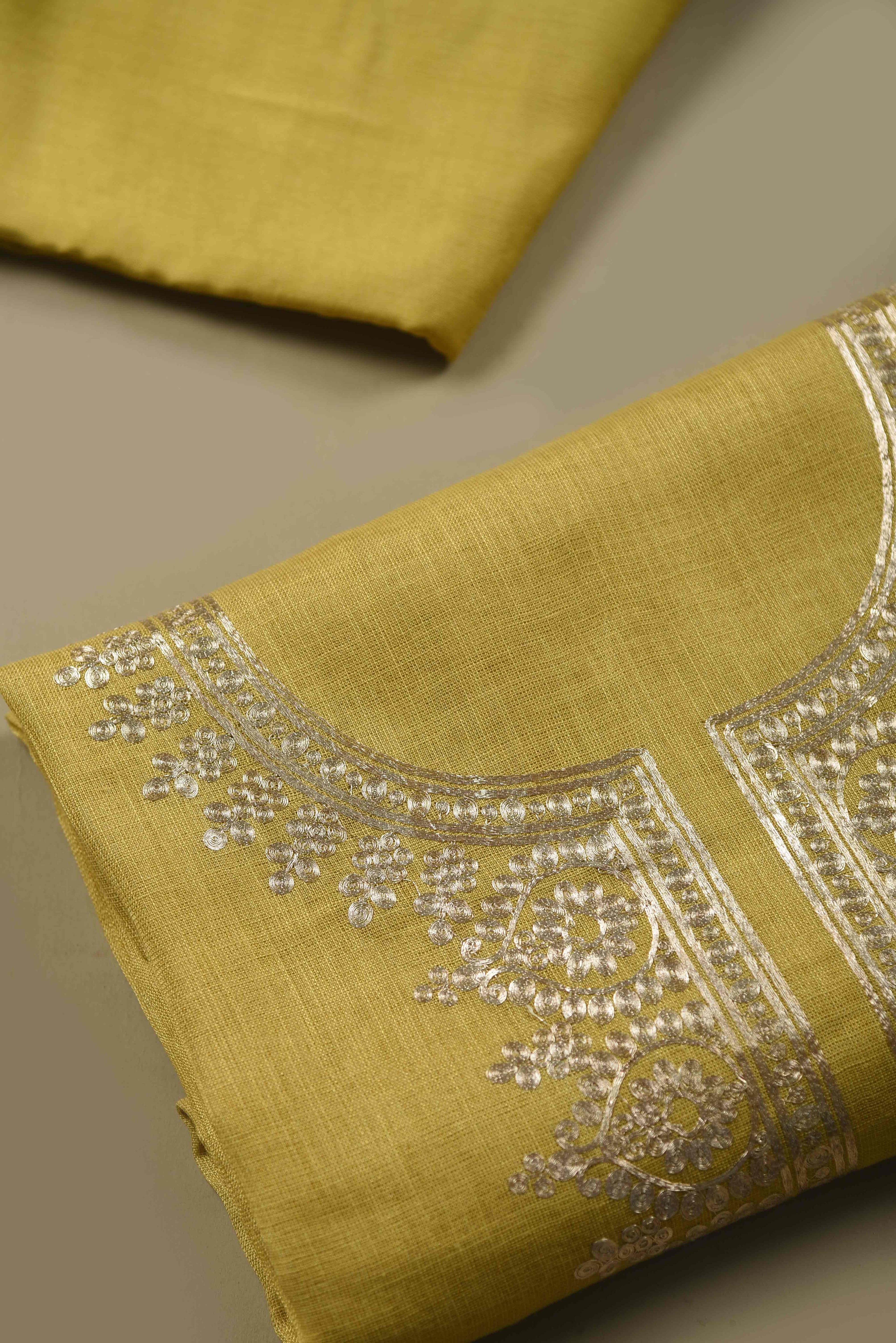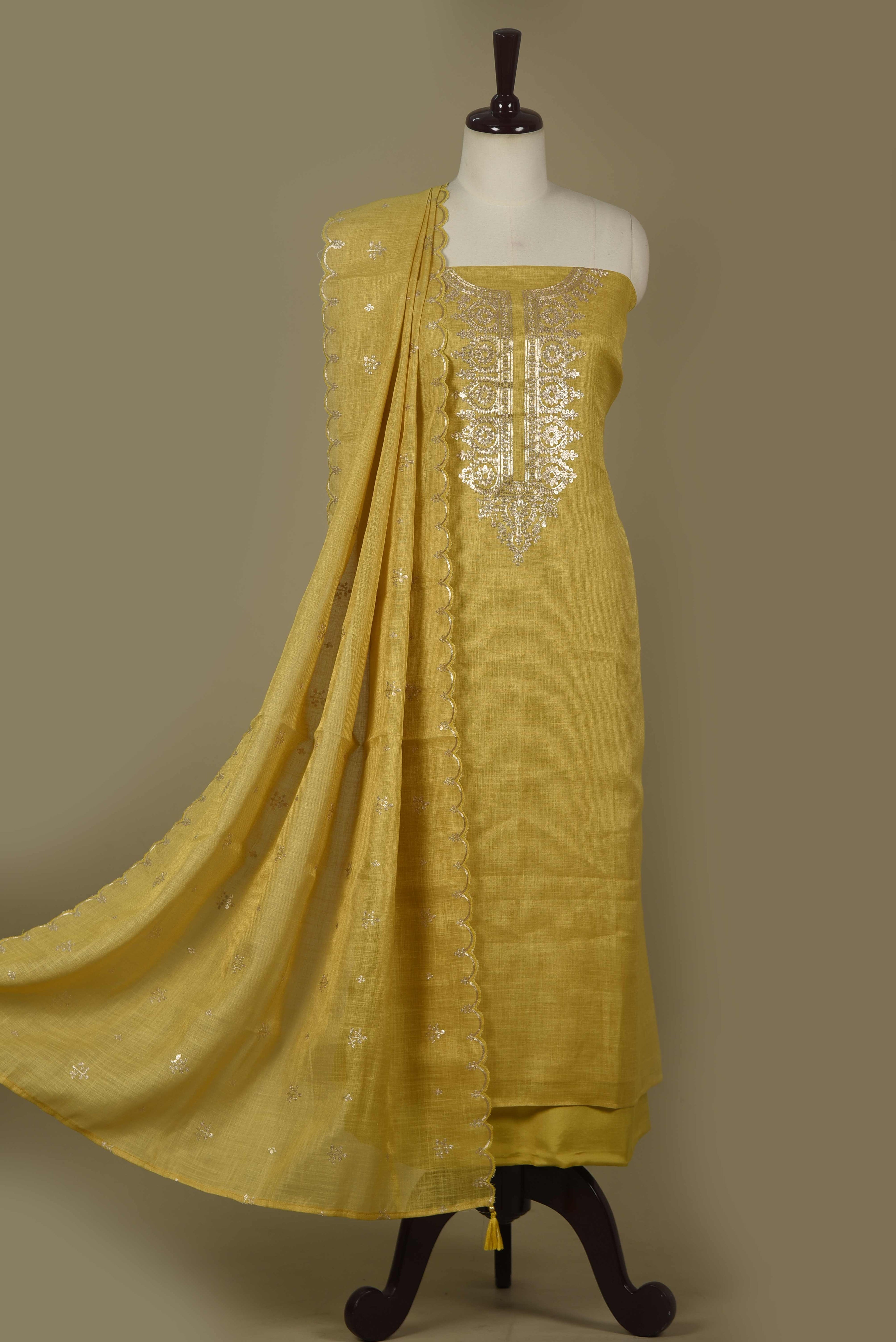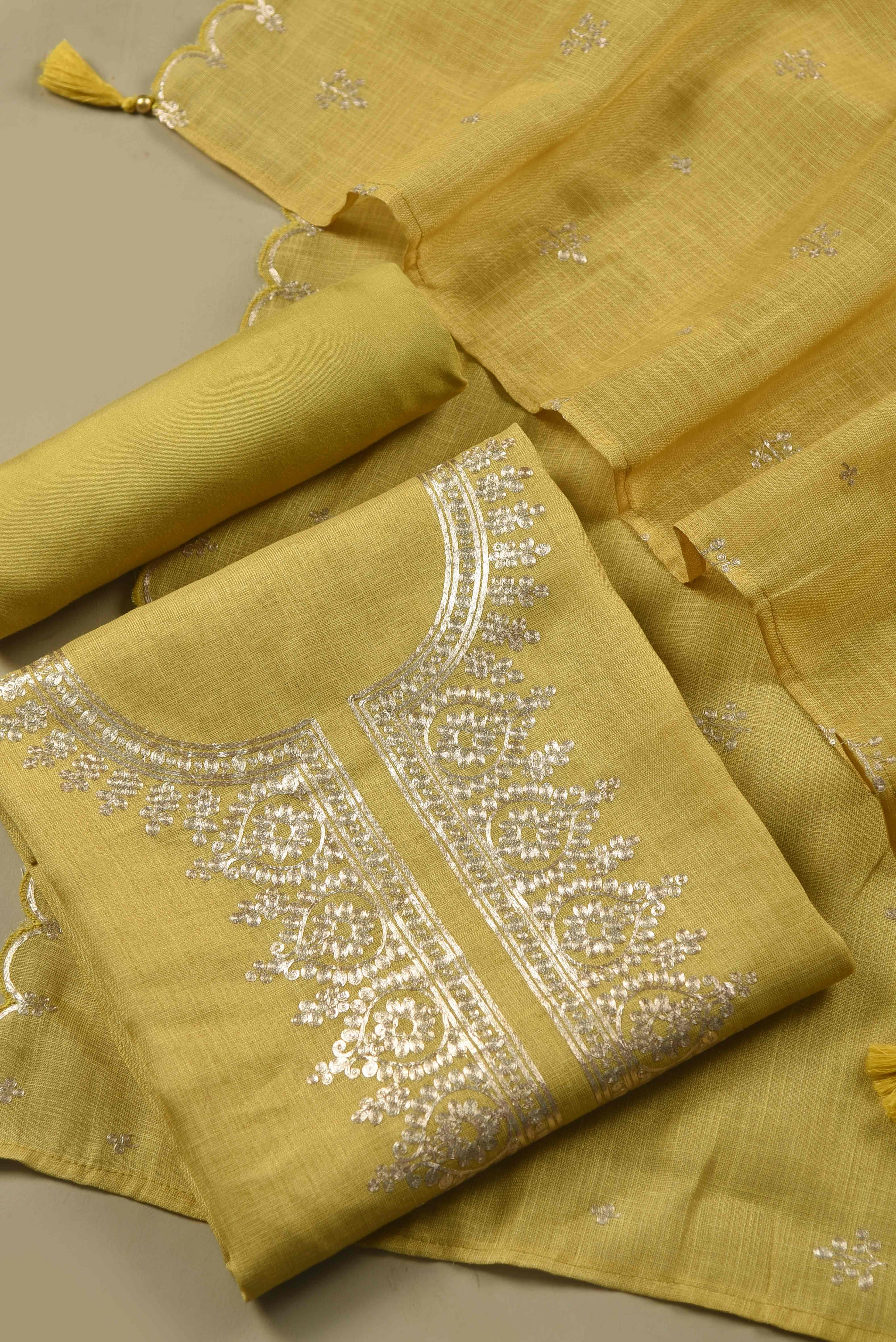 Yellow Linen Zari Embroidered Unstitched Suit Fabric Set with Linen Zari Embroidered Dupatta