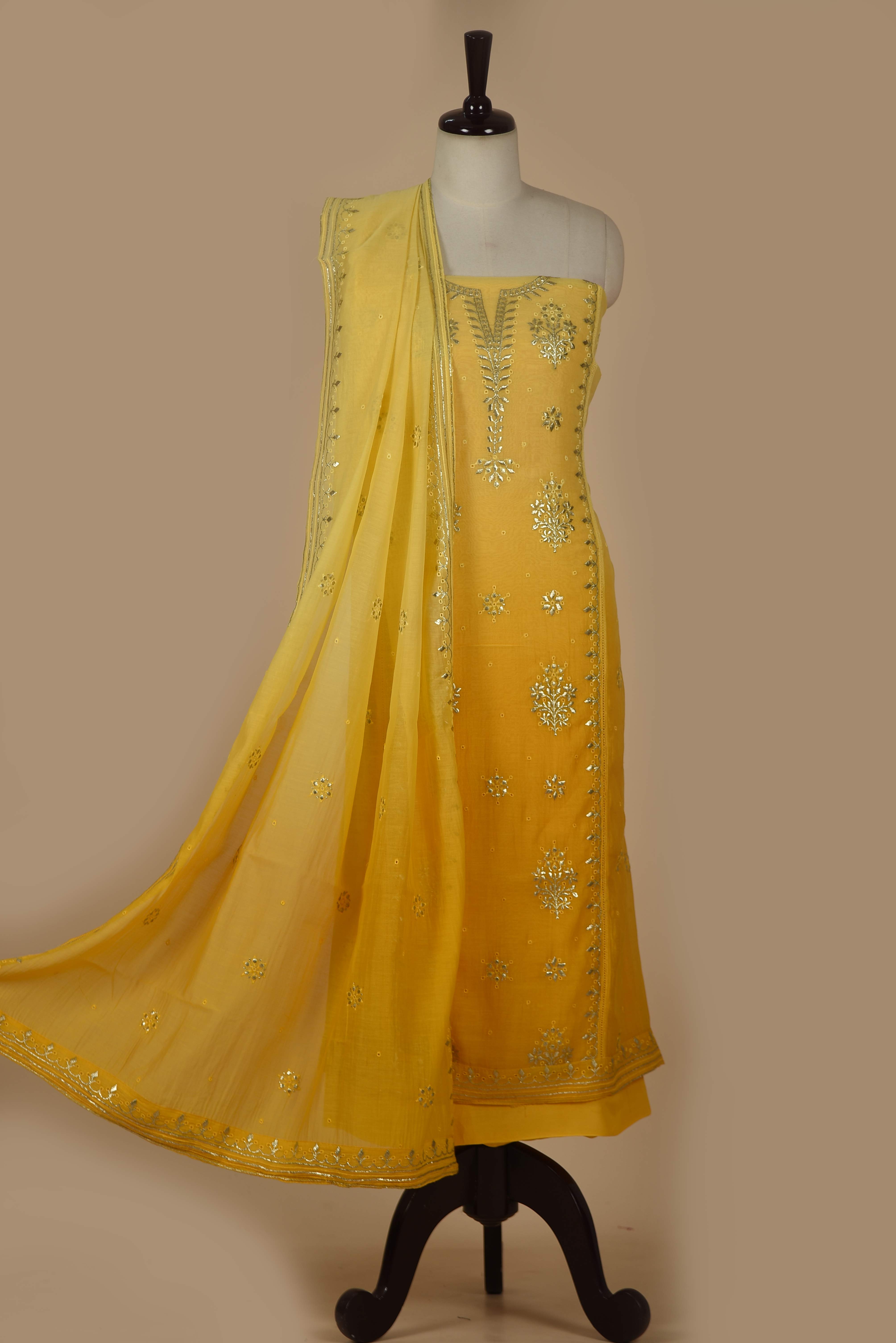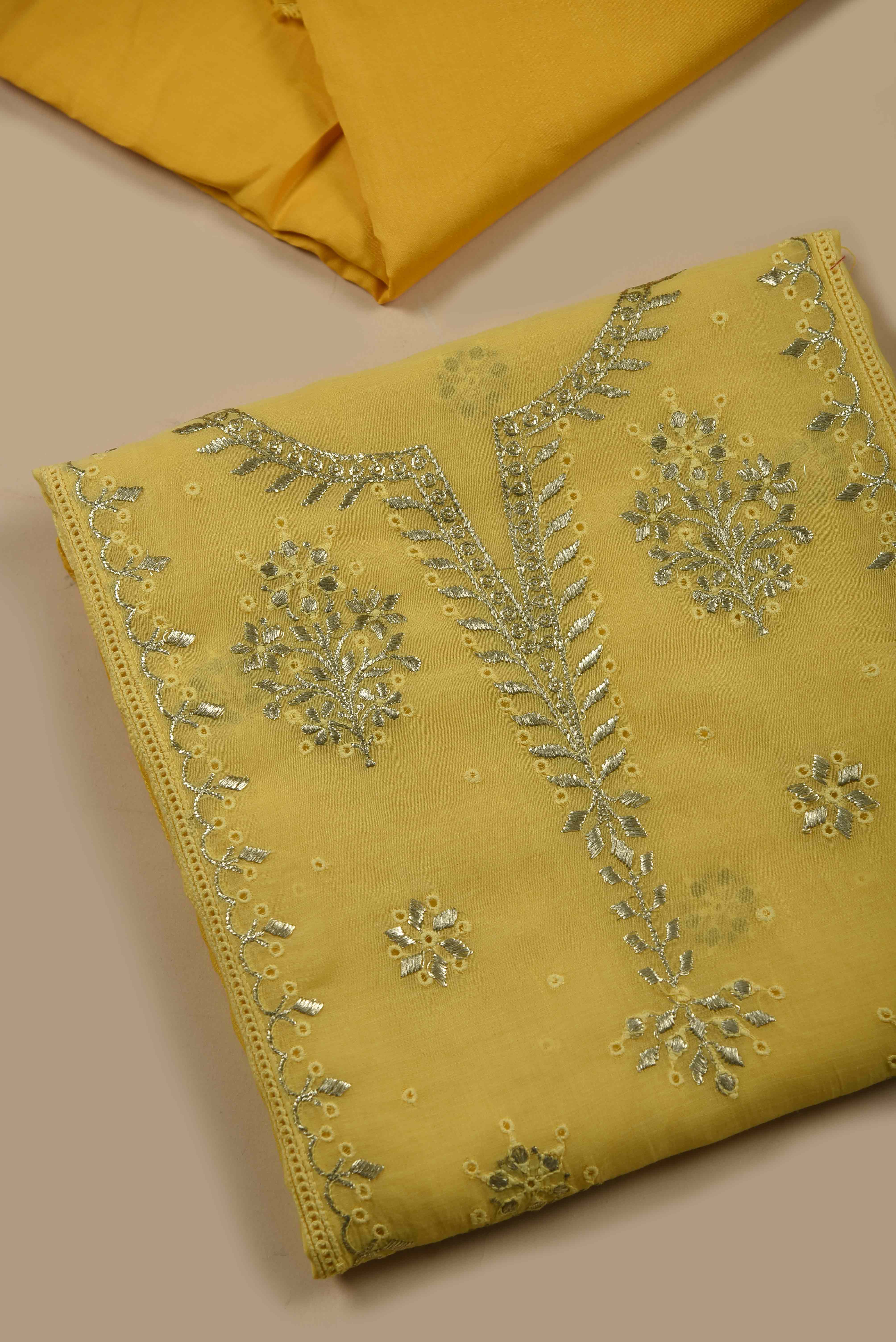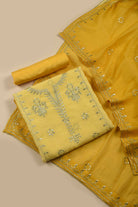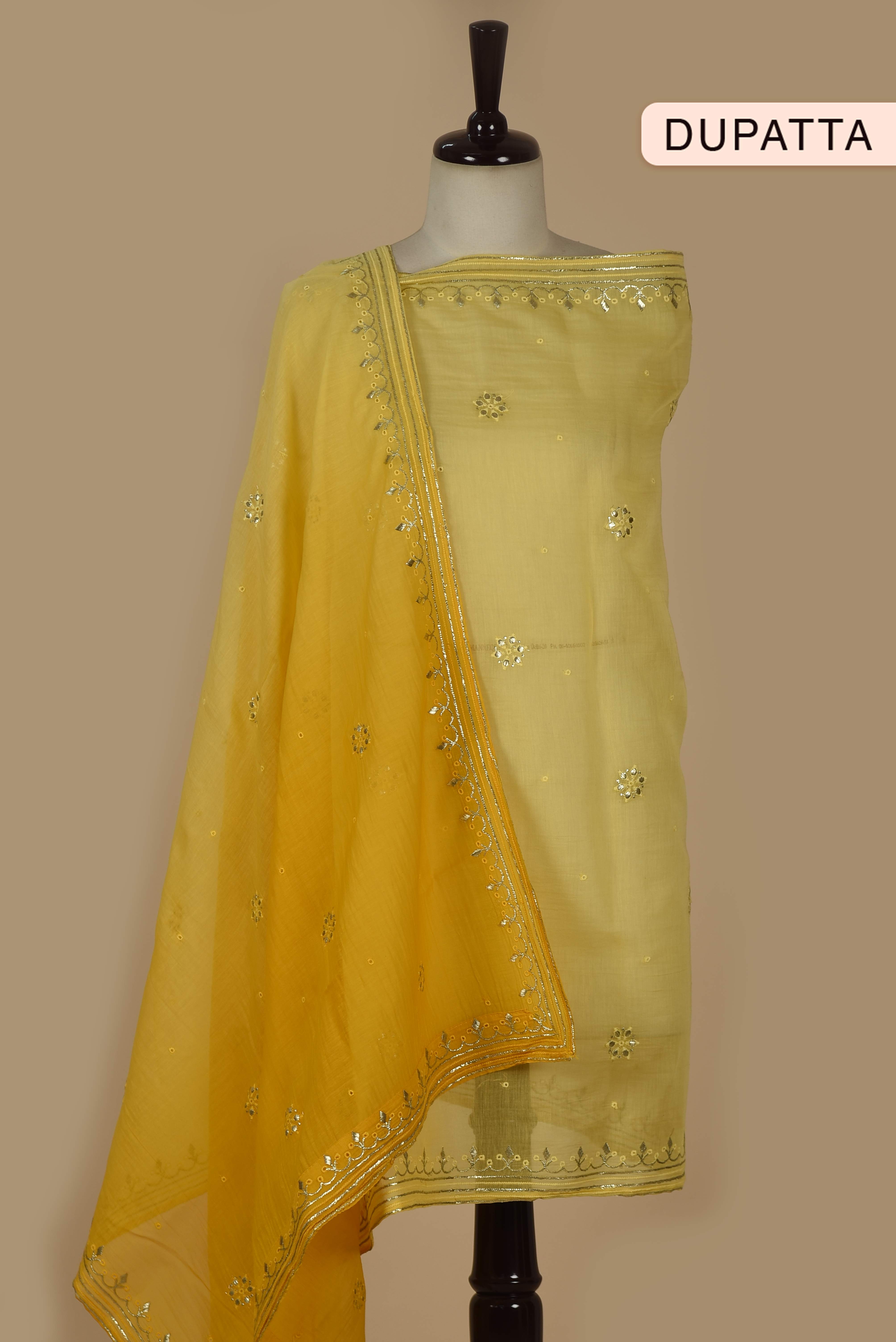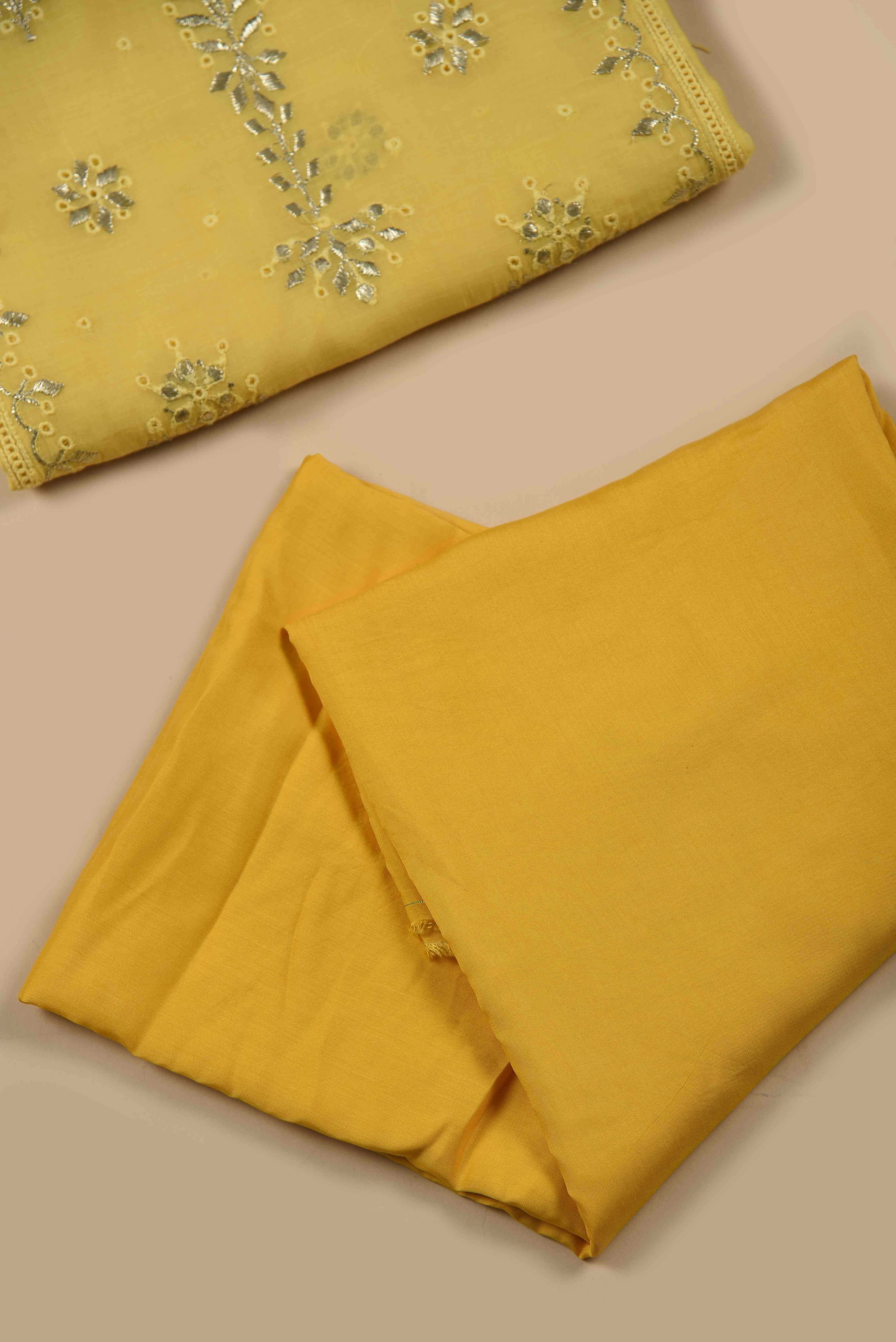 Yellow Mul Chanderi Embroidered Unstitched Suit Fabric Set With Mul Chanderi Embroidered Dupatta