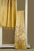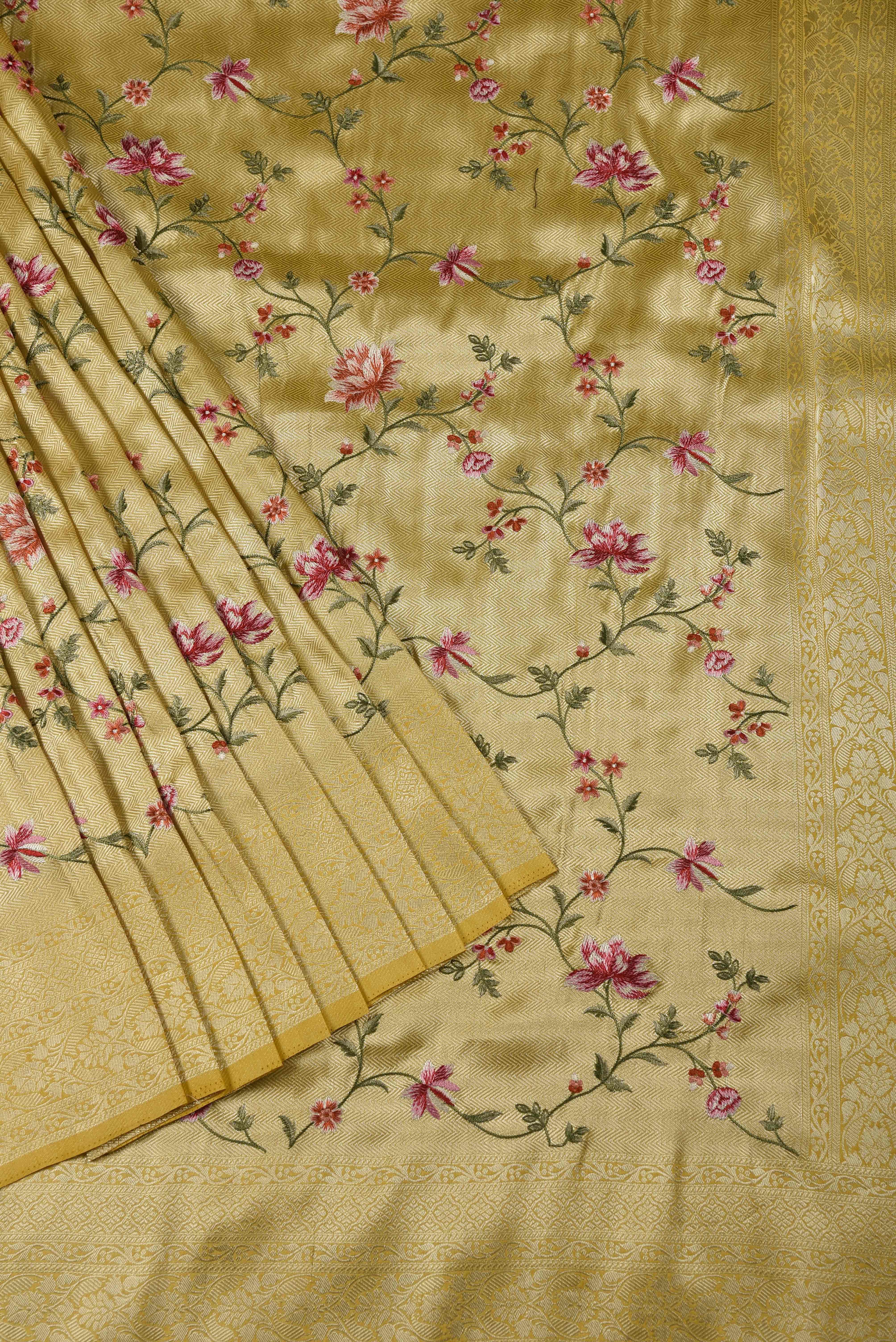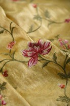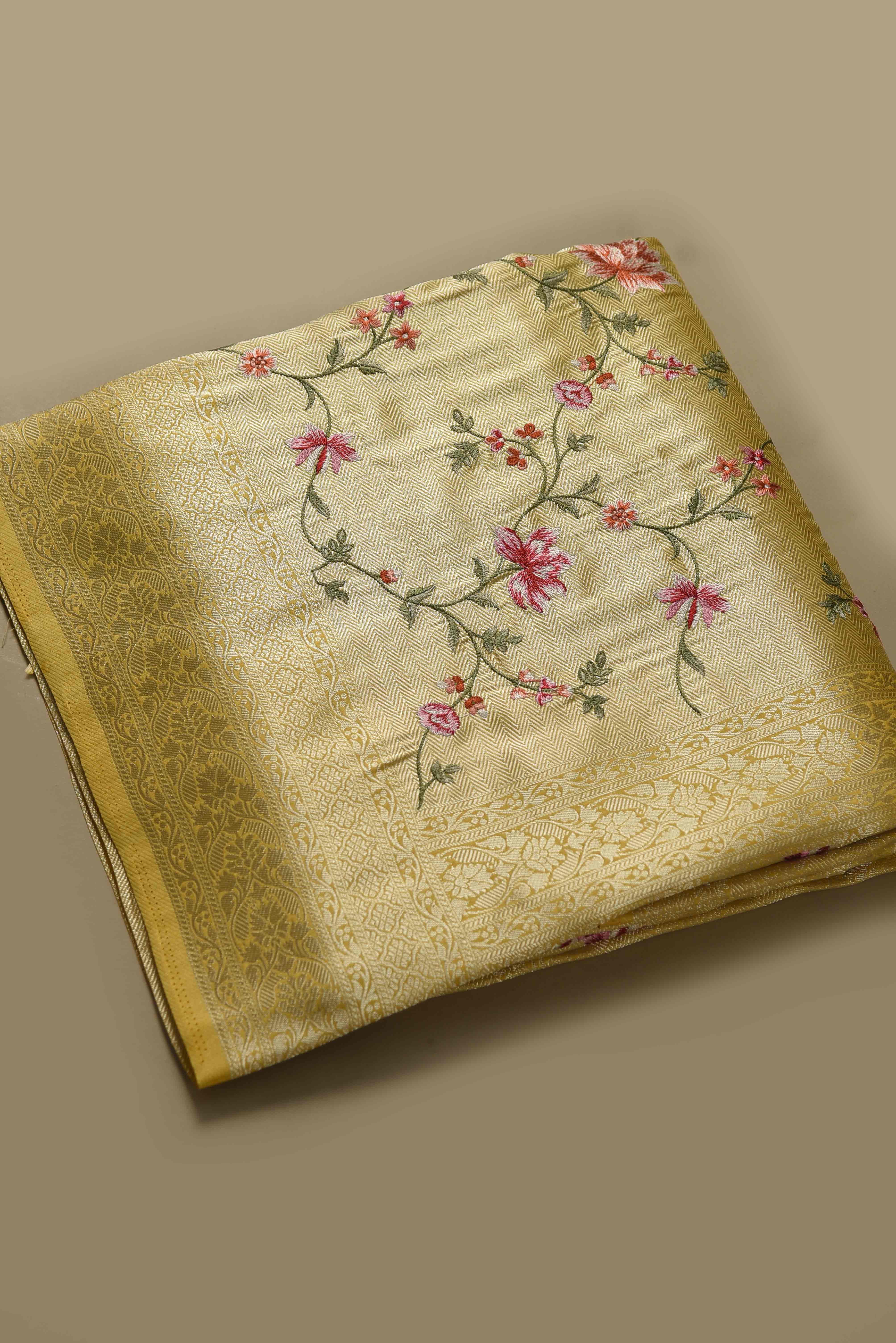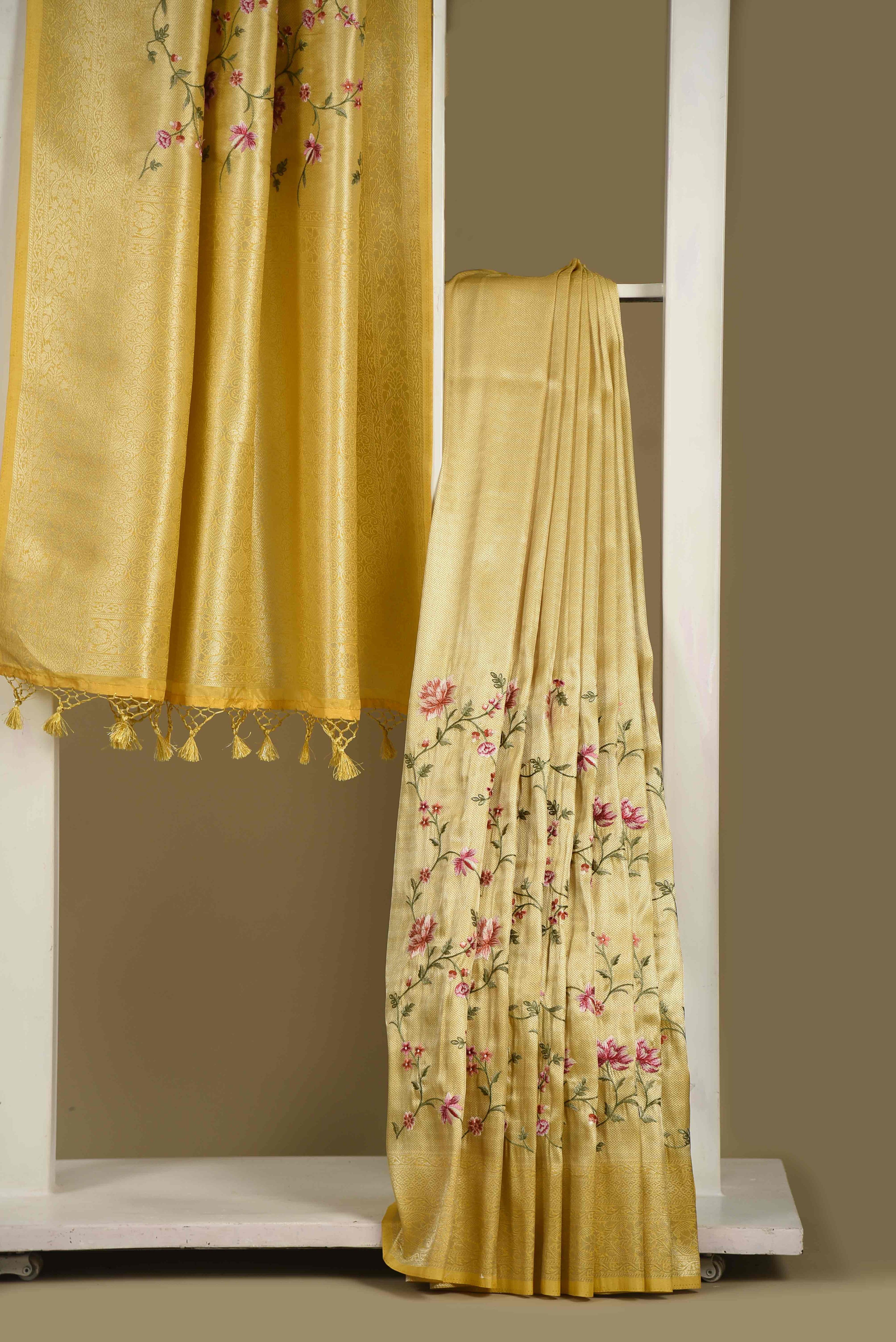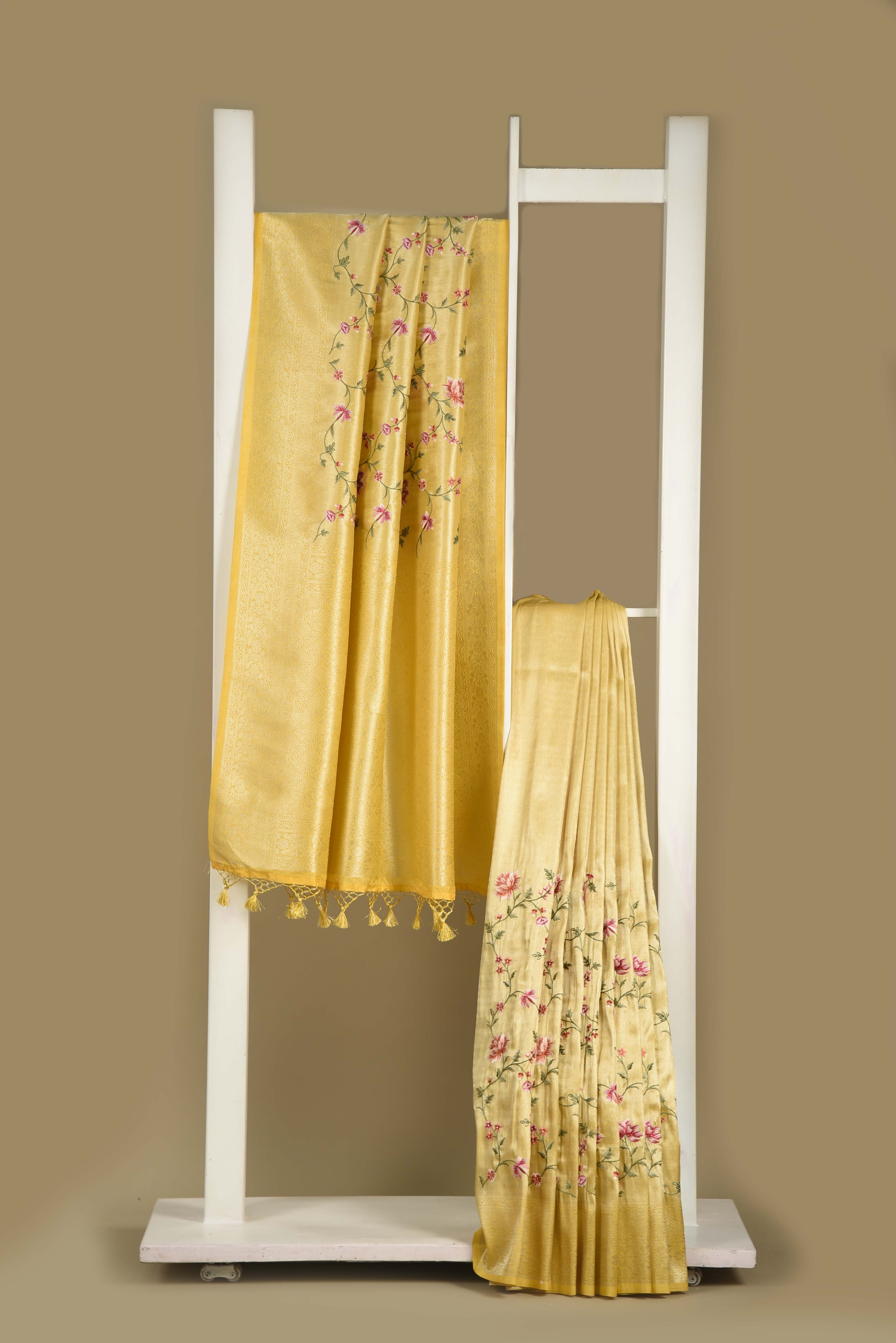 - The vibrant yellow hue is beautifully elevated with intricate woven motifs and exquisite floral embroidery, spread across the saree to create a look of timeless sophistication.